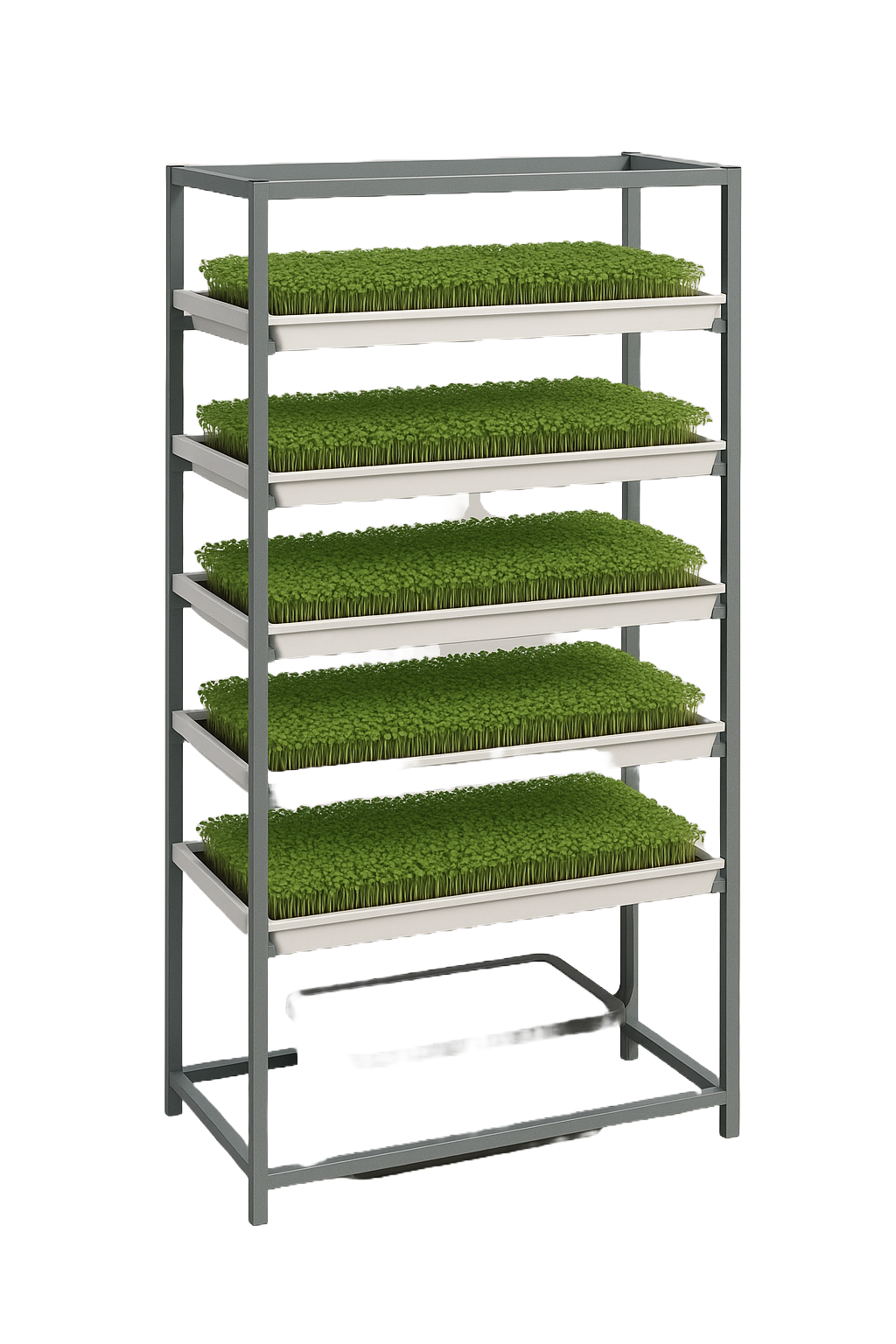 Estrutura que comporta de até 40 bandejas , organizadas verticalmente e espaçadas em 30 cm, o sistema maximiza o aproveitamento do espaço e permite alta produtividade em áreas reduzidas. A solução é ideal para uso urbano, estufas, varandas, quintais, escolas, projetos sociais e produção comercial de alimentos frescos.