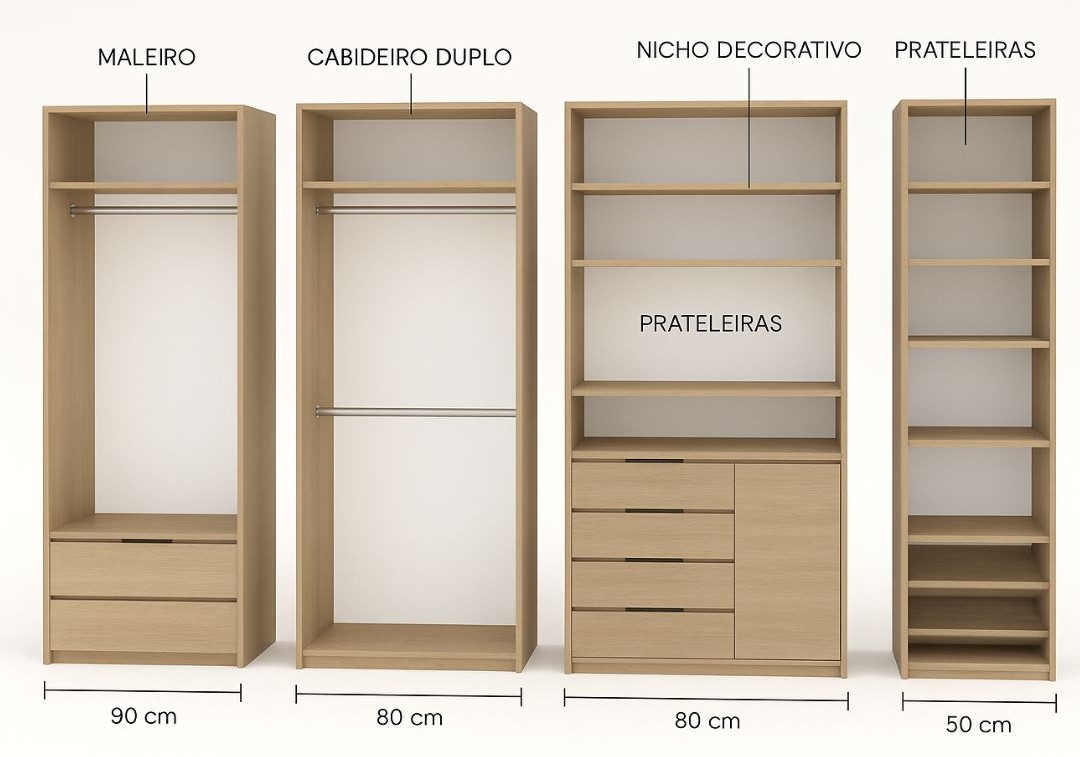 Com um sistema de módulos independentes, o closet permite combinações ilimitadas: prateleiras, nichos, cabideiros, gaveteiros e painéis funcionais que podem ser adicionados ou reposicionados conforme a necessidade. Essa flexibilidade garante que o ambiente evolua junto com você.